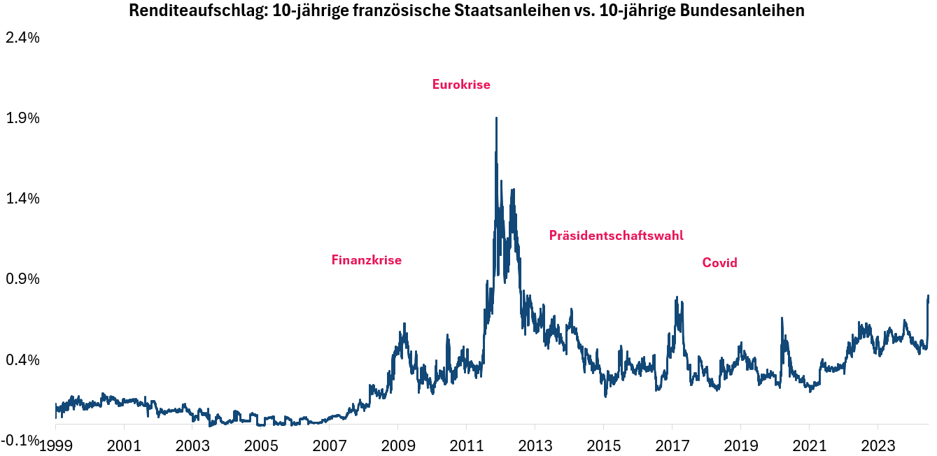 Beide Länder sind nach den Europawahlen wieder in den Fokus der Finanzmärkte gerückt. Insbesondere der französische Präsident hat mit seiner Ankündigung von Neuwahlen für Irritationen gesorgt. Die Risikoaufschläge französischer Staatsanleihen gegenüber Bundesanleihen steigen stark an, und französische Aktien bilden seitdem das Schlusslicht in Europa. Muss man nun eine neue Staatschuldenkrise mit höheren Risikoaufschlägen in der Breite rechnen? Wohl eher nicht, lautet die Antwort. Vielmehr impliziert das Ende der Nullzinspolitik nun die Notwendigkeit einer differenzierteren Betrachtung von Emittentenrisiken wie die von Frankreich.
