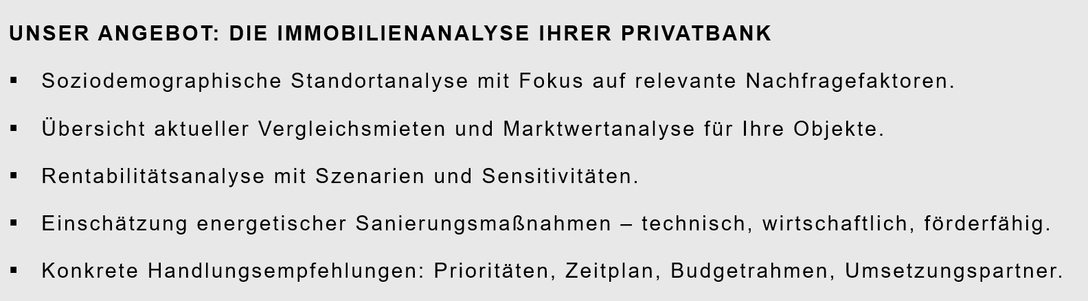 Wenn Sie wissen möchten, wo Ihr Bestand unterschätzte Werthebel oder stille Risiken verbirgt, sprechen Sie uns an. Vereinbaren Sie jetzt Ihre Immobilienanalyse bei uns. Denn mit guter Planung sind Sie langfristig besser beraten.