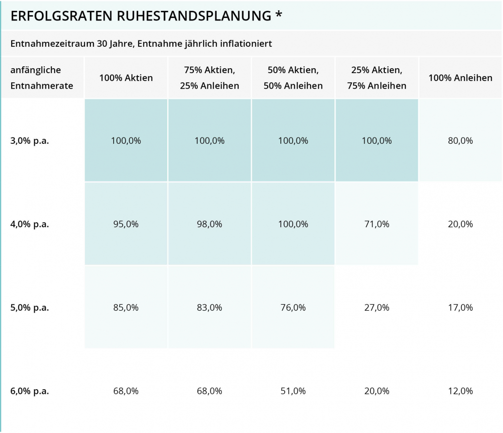 * Quelle: Philip L. Cooley, Carl M. Hubbard und Daniel T. Walz (Trinity College): “Retirement Savings: Choosing a Withdrawal Rate That Is Sustainable”, AAII Journal 02.1998 (Fachmagazin für Anleger). In der Studie wurden rollierende 30-Jahres-Zeiträume im Zeitraum 1926 bis 1995 auf Basis von US-Aktien (S&P500), US-Unternehmensanleihen und US-Inflationsdaten (CPI) ausgewertet. Ziel der Studie war eine Überprüfung der sogenannten Bengen-Regel bzw. Safemax-Rate.